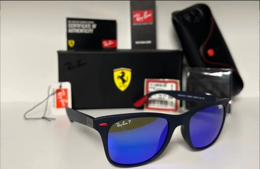Su marco azul mate con detalles en rojo Ferrari aporta un look premium y distintivo, mientras que los lentes espejados azules polarizados reducen reflejos, mejoran el contraste visual y brindan una experiencia de claridad total —perfectos para manejar o usar bajo el sol intenso.